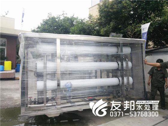 河南友邦型號為YB-CJS-005的反滲透純凈水設備正在裝車發往山東濟南。 5噸每小時小型反滲透純凈水設備就是每小時大出水量是5噸,由于該設備的出水量比較小,一般應用在